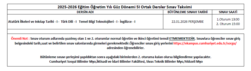 5ı Ortak Dersler Bütünleme Sınav Tarihleri İçin Tıklayınız