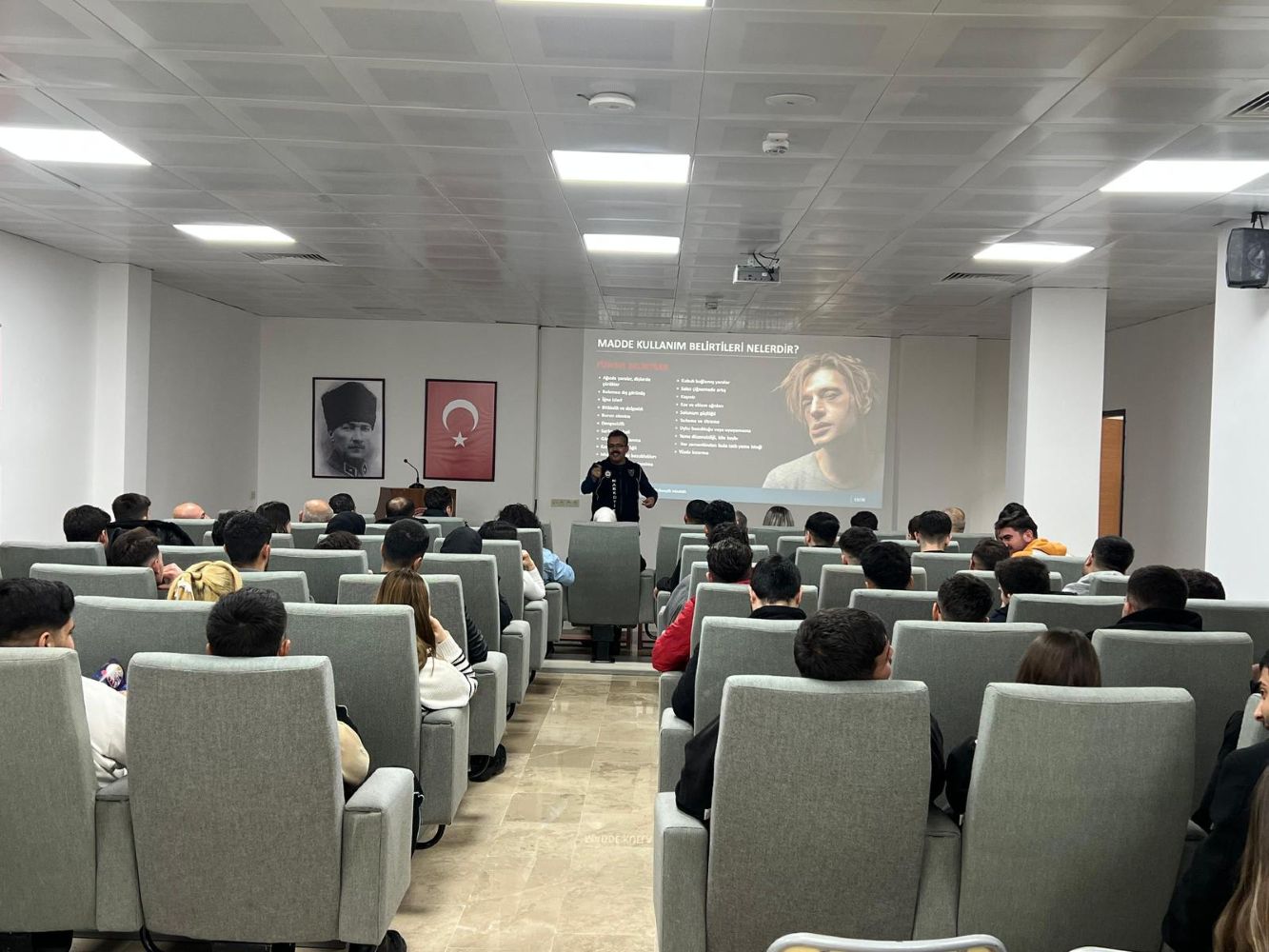 Programda bağımlılıkla mücadelede farkındalığın önemi, gençlerin karşılaşabileceği riskler ve korunma yolları ele alındı. Sunum, katılımcılar tarafından ilgiyle takip edildi.