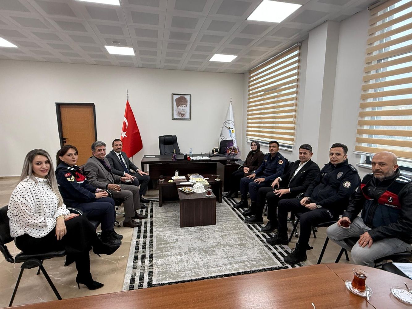 Seminerin ardından Yüksekokul Müdürümüz Doç. Dr. Seval Elden Ürgüp’ü makamında ziyaret eden protokol üyeleri, eğitim üzerine bir süre sohbet etti. TEM Şube Müdürü Adem Ceylan tarafından Doç. Dr. Seval Elden Ürgüp’e günün anısına hediye takdim edildi. Program, çekilen hatıra fotoğrafıyla sona erdi.