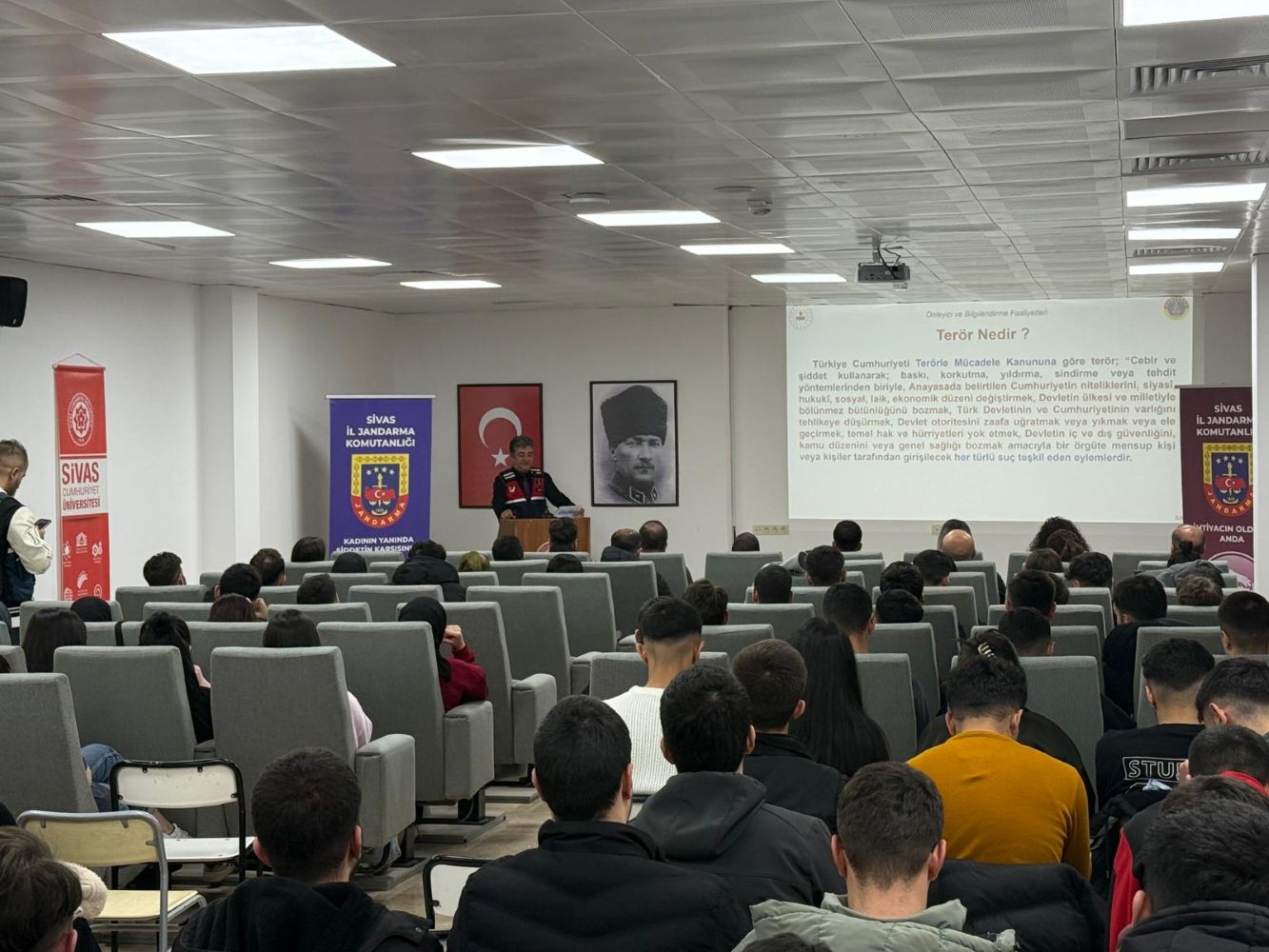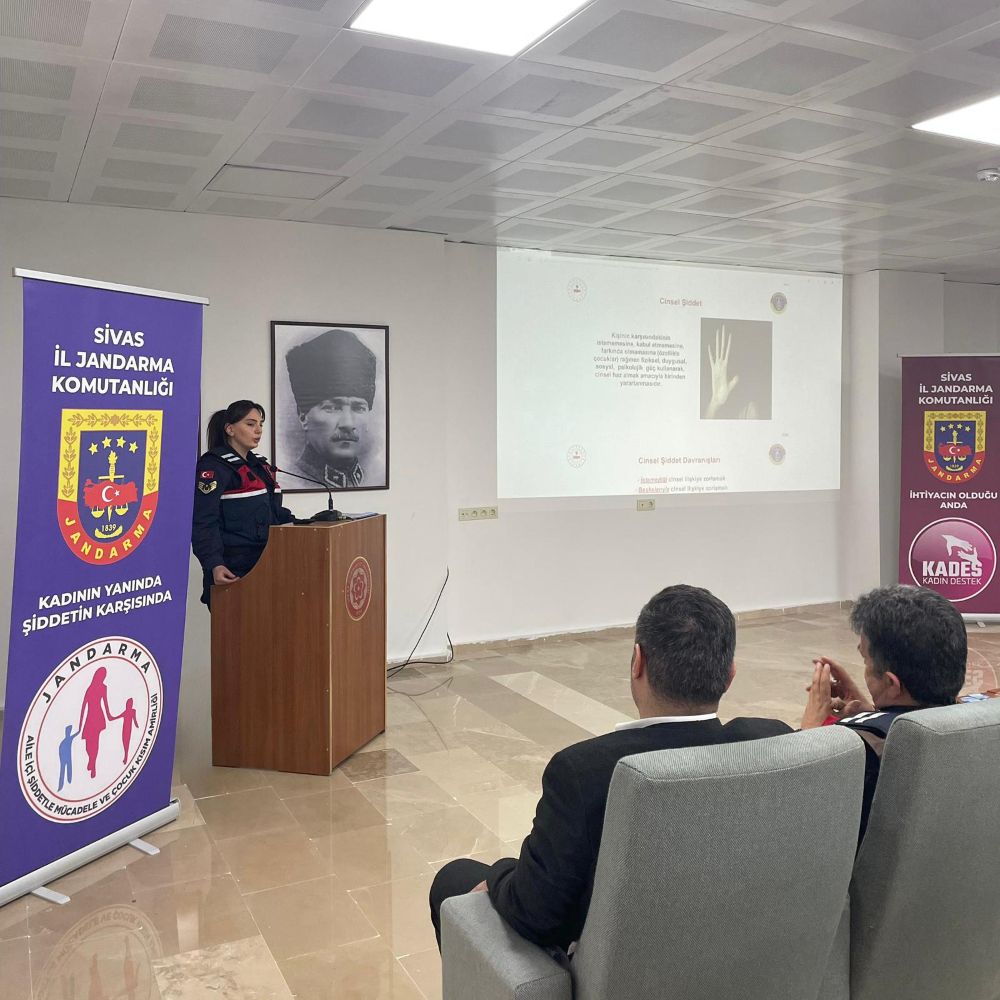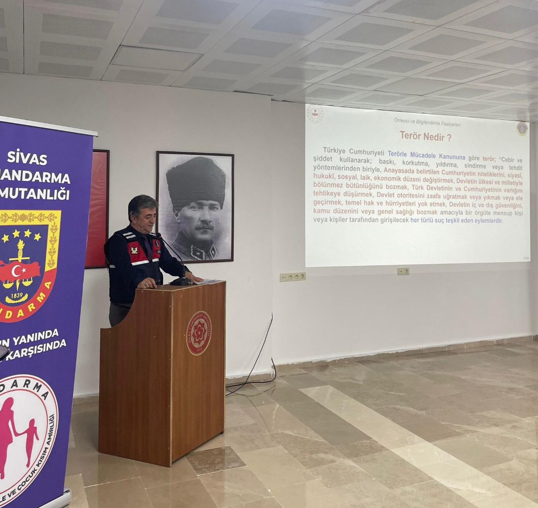 Meslek Yüksekokulumuz ile Sivas İl Jandarma Komutanlığı iş birliğiyle, öğrencilere yönelik "Terörle Mücadele ve KADES" bilgilendirme programı düzenlendi. İlçe Kaymakamı Sayın Fatma Bayalan ve ilçe protokolünün katılım sağladığı etkinlikte; TEM Şube Müdürü Jandarma Astsubay Kıdemli Başçavuş Adem Ceylan terörle mücadele üzerine önemli bilgiler paylaşırken, Jandarma Asayiş Astsubay Üstçavuş Emine Gürbüz ise kadınların güvenliği için hayati önem taşıyan KADES uygulamasını anlattı. Eğitim sonunda öğrencilere, sunulan konuları pekiştirmek amacıyla bilgilendirici broşürler dağıtıldı.
